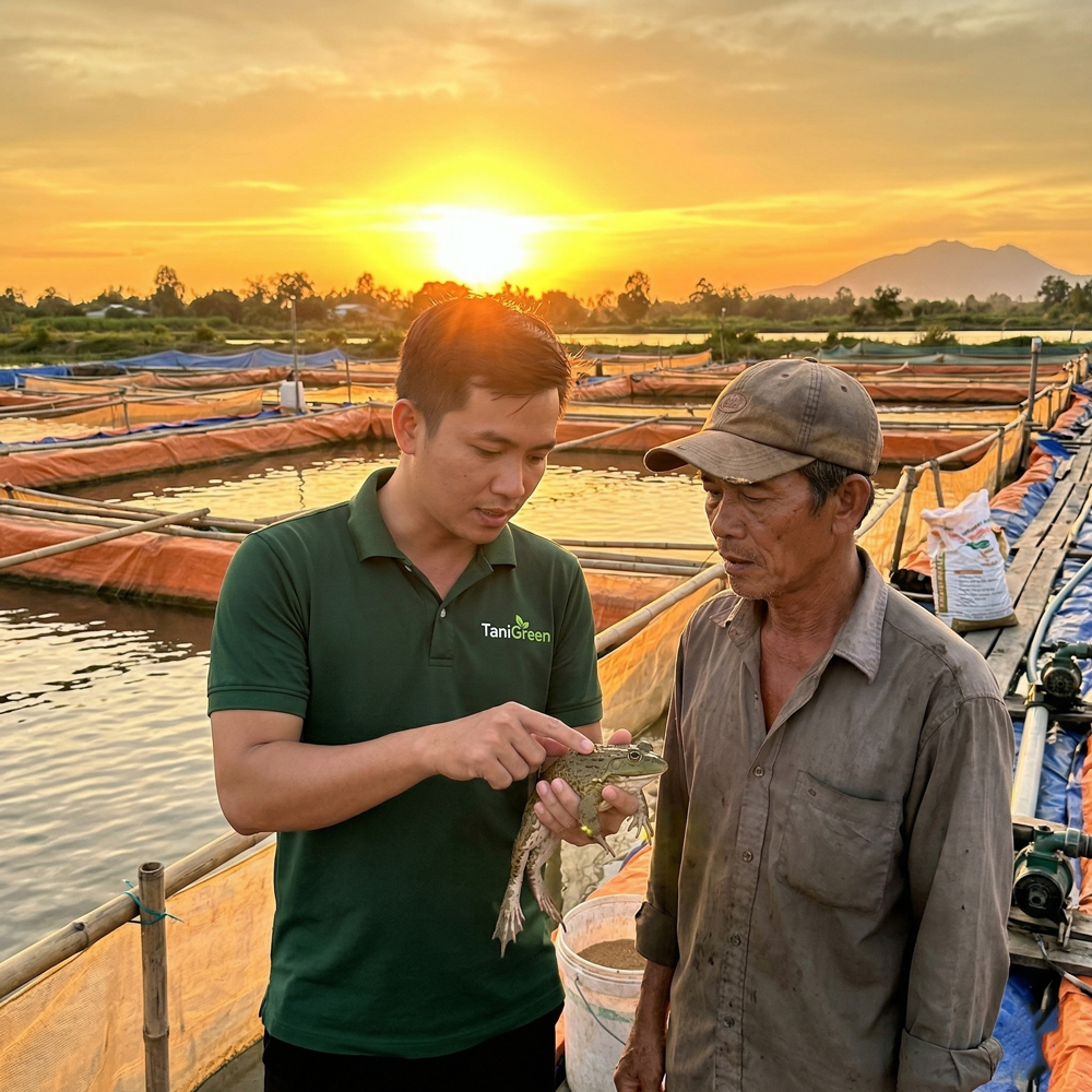 Sứ mệnh của TaniGreen là cung cấp giải pháp nuôi ếch toàn diện từ kỹ thuật, dinh dưỡng đến đầu ra, giúp bà con giảm rủi ro, tối ưu chi phí và nâng cao hiệu quả kinh tế.